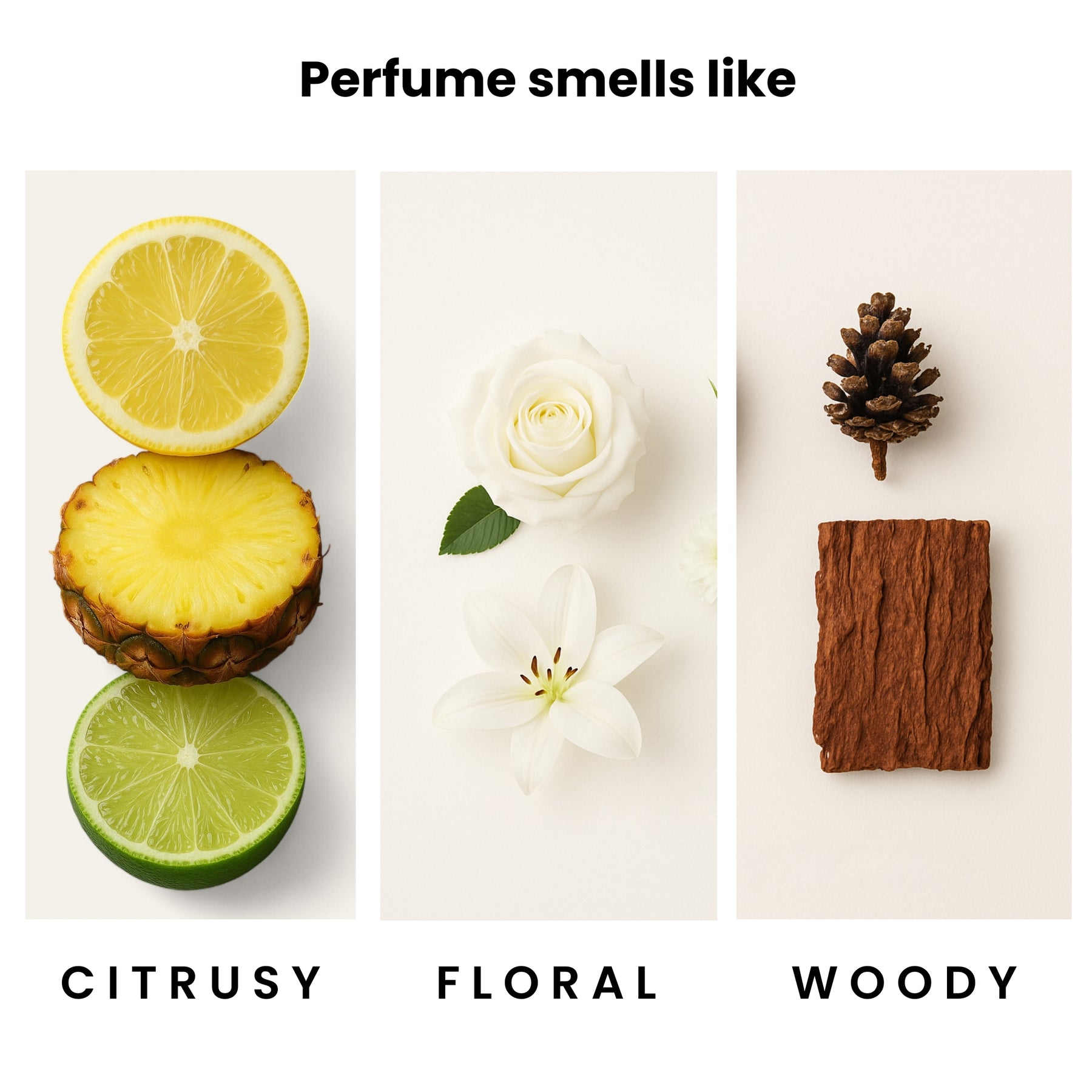 How perfume smells: Citrus, Floral, and Woody.